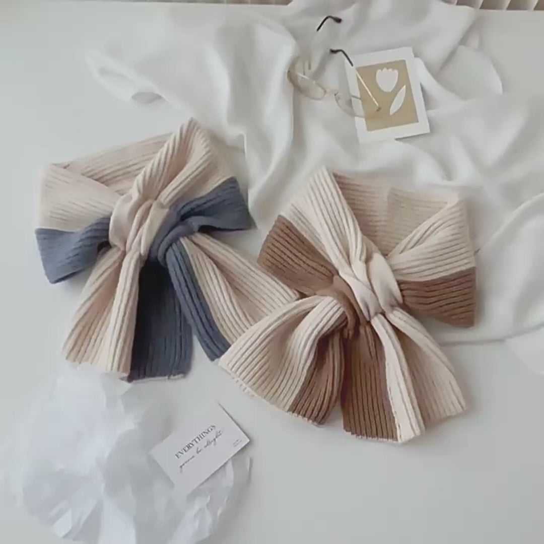 Cute, cozy, and irresistibly stylish — this colorblock knit bow scarf adds the perfect finishing touch to your fall and winter wardrobe.