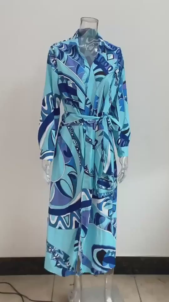 Fashion Printed Shirt Dress With Belt Slim Fit Three-quarter Sleeve Lapel Dress For Women Clothing