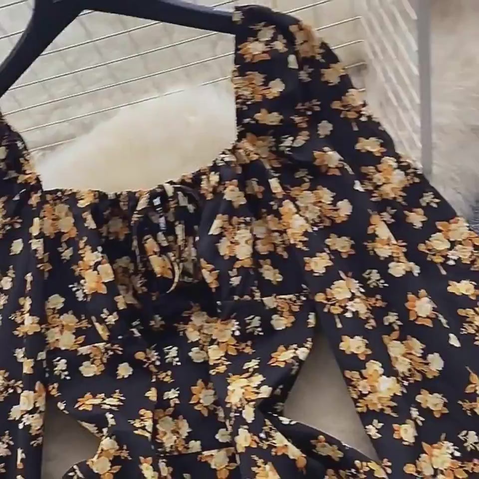 Flowers Printing Long Sleeve Dress Fashion Square-neck Bottom Slit Dresses Womens Clothing