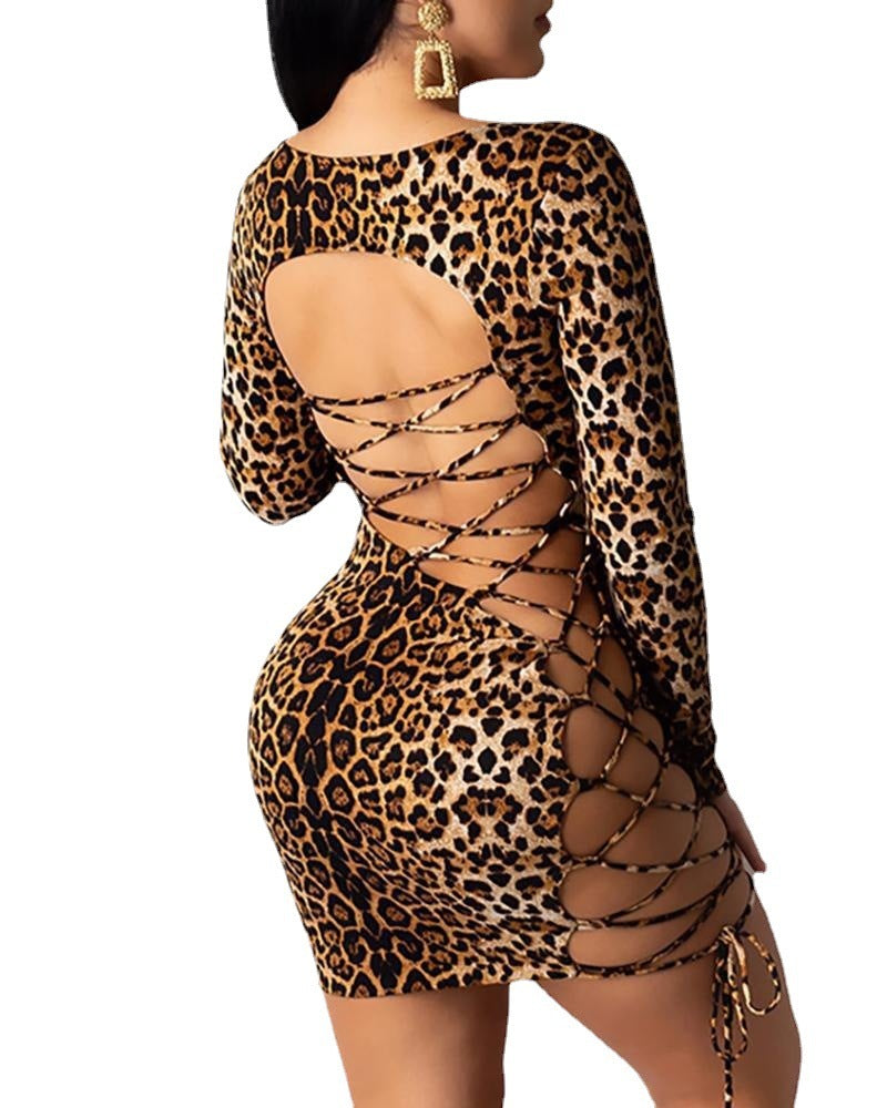 Women's Leopard Print Backless Lace-up Long Sleeve Dress