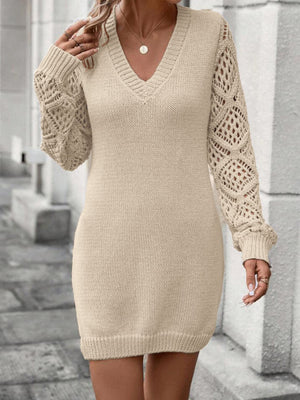 New V-neck Knitted Dress Fashion Solid Color Hollow Long-sleeved Sweater Dresses Women's Clothing