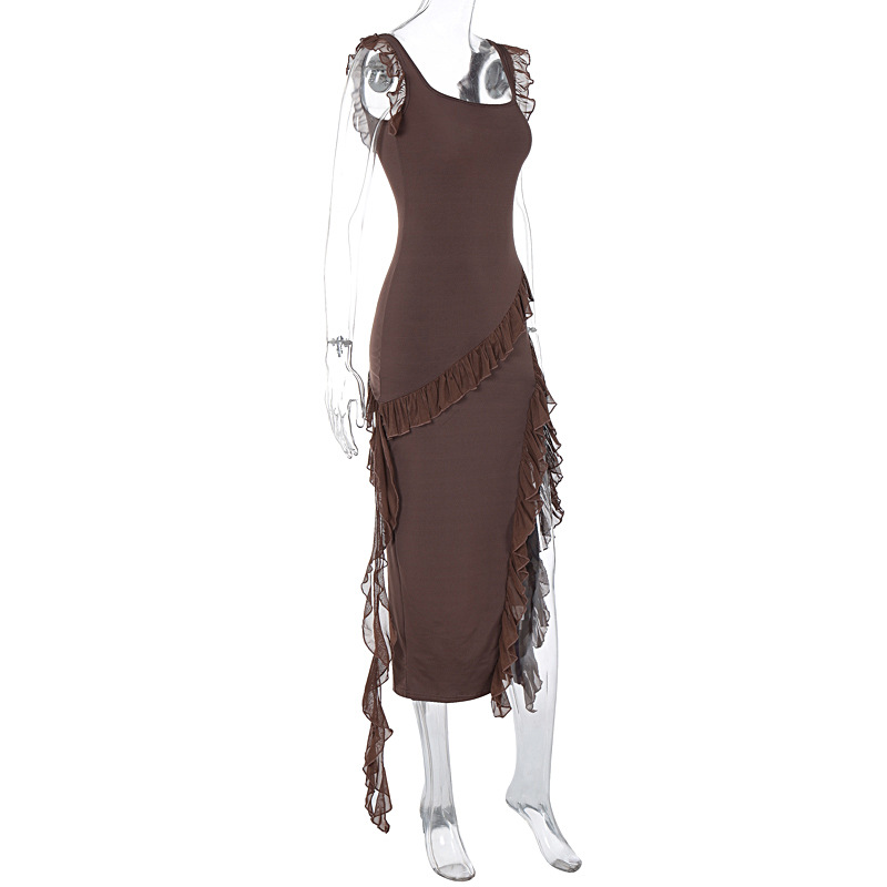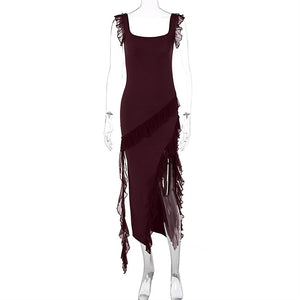 Ruffle Thigh High Split Dress Women Sexy Spaghetti Strap Square Neck Backless Suspender Dresses For Evening Praty Clothing