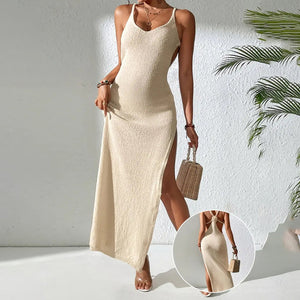 Sexy Cutout Slim Fit Slit Spaghetti Straps Knitted Beach Dress