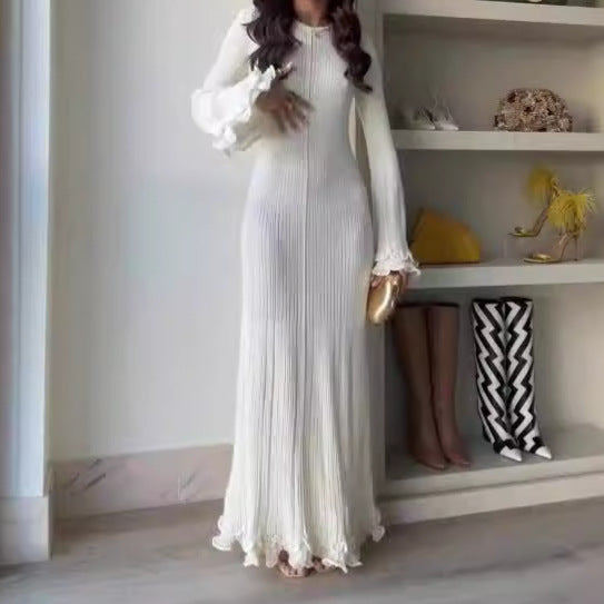 Solid Color Round Neck Long Sleeve Slim Fit Stringy Selvedge Dress