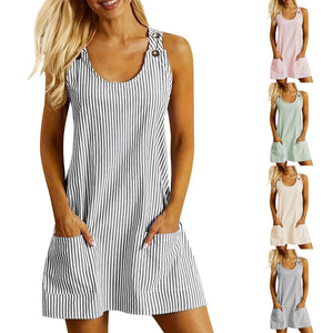 Summer Fashion Striped Patchwork Commuting U-Neck Sleeveless Pockets Back Button Casual Straight Slimming Mini Dress For Women