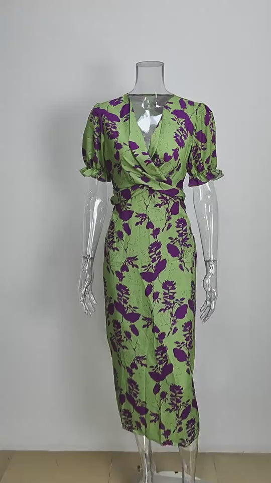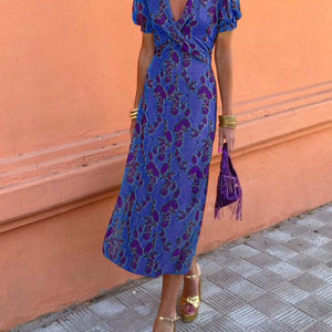 Summer V-neck Short-sleeved Dress Fashion Flowers Printed Slim Beach Dresses For Women Clothing