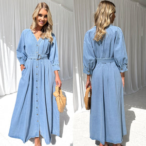 V-neck Lace-up Waist Trimming Casual Button Denim Dress