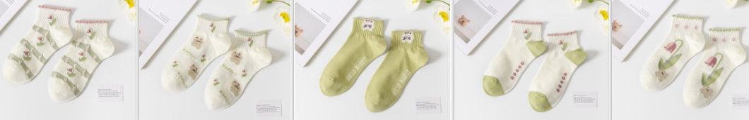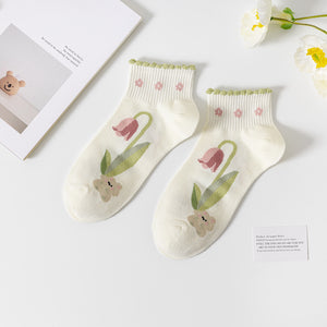 Made from high-quality cotton, these fashionable ankle socks feature playful rolled hems, tulip embroidery, and bunny designs. With sweat-absorbing and non-slip properties, they’re perfect for everyday wear in any season.