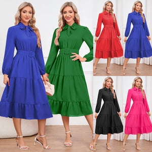 Women’s Elegant A-Line Bow Tie Midi Dress – Long Sleeve Slim Fit