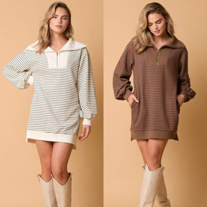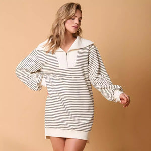 Women's Long Sleeve Polo Collar Stripes Loose Dress