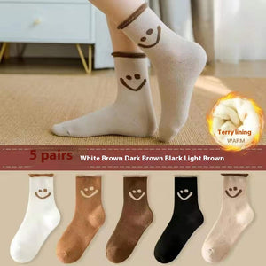 Made from a soft polyester-cotton blend, these socks are thick, warm, and perfect for autumn and winter wear. Each pack includes 5 pairs in different styles, from solid colors to fun designs like smiley faces, letters, and color matching, making them both practical and stylish.